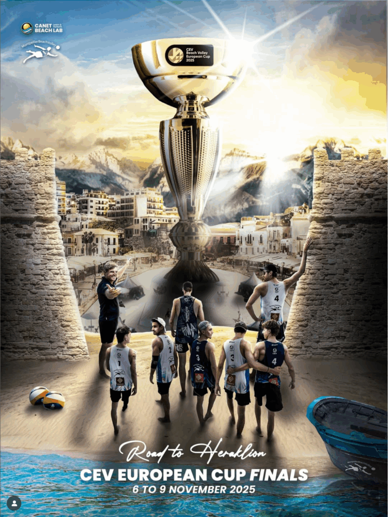 Après s’être qualifié pour les phases préliminaires de la Coupe d’Europe des Clubs, le Montpellier Beach Volley (Arthur, Noah, Théo, Iskander, Jérémie, Solomon et Stéphane) s’est rendu à Héraklion du 6 au 9 novembre 2025 pour les finales de cette compétition regroupant les 8 meilleures équipes d’Europe.